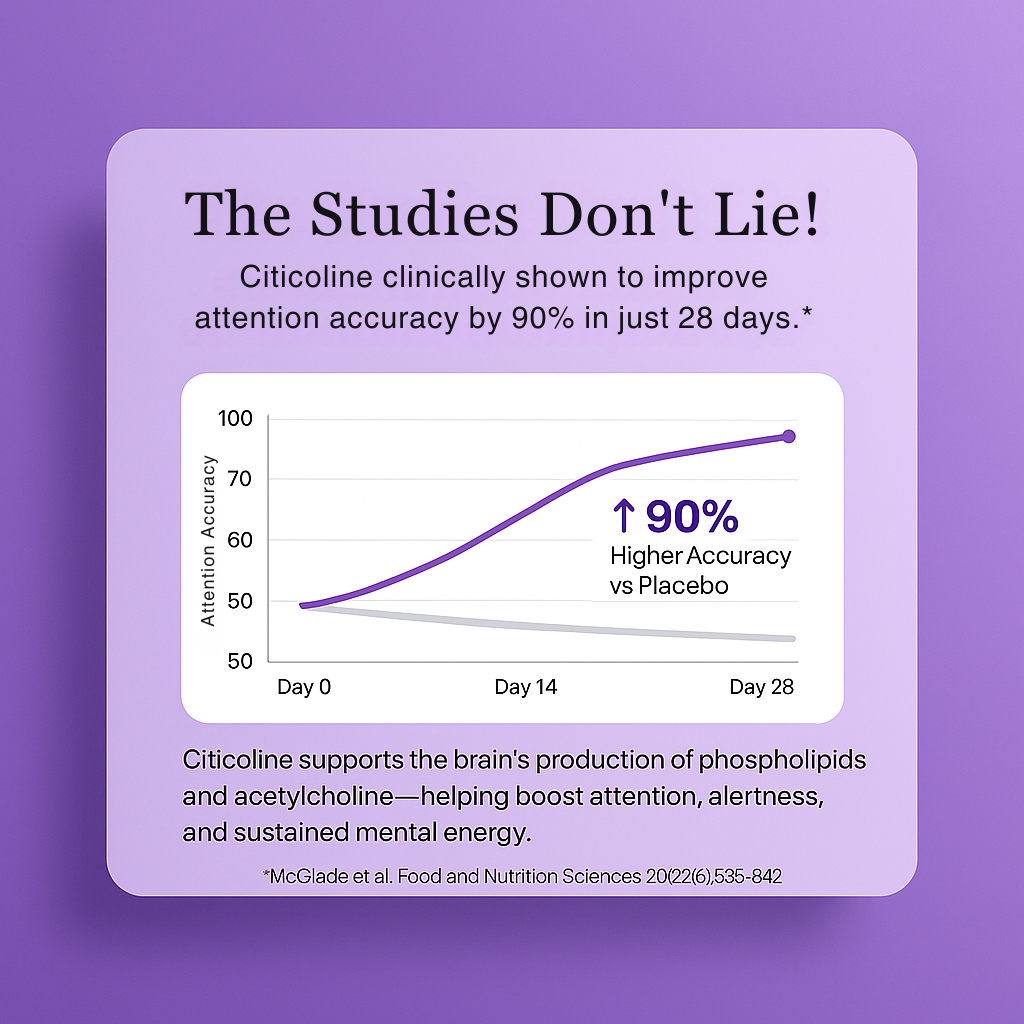 A 2014 randomized, double-blind, placebo-controlled study published in Food and Nutrition Sciences found that 250mg of Citicoline daily for 28 days significantly improved attention, psychomotor speed, and impulsivity control in healthy adult women