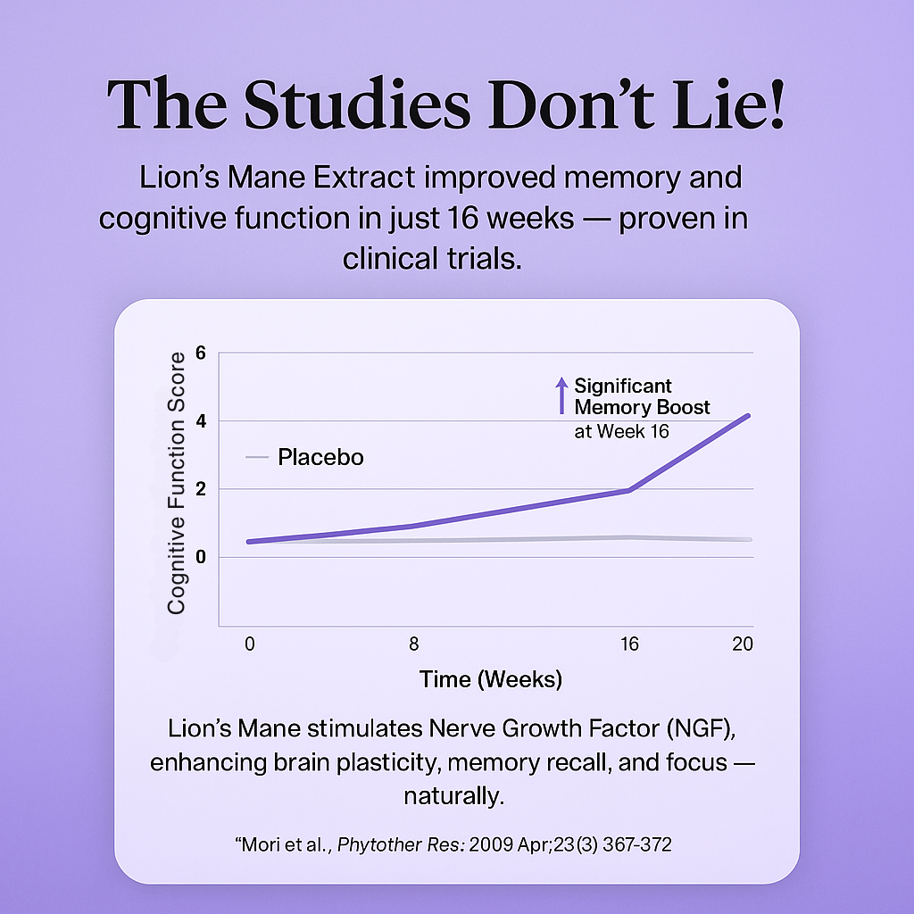 A 2009 double-blind, placebo-controlled study in Japan gave Lion’s Mane to older adults for 16 weeks. The group taking Lion’s Mane showed significantly better scores in memory and focus — and the effects kept improving the longer they took it.