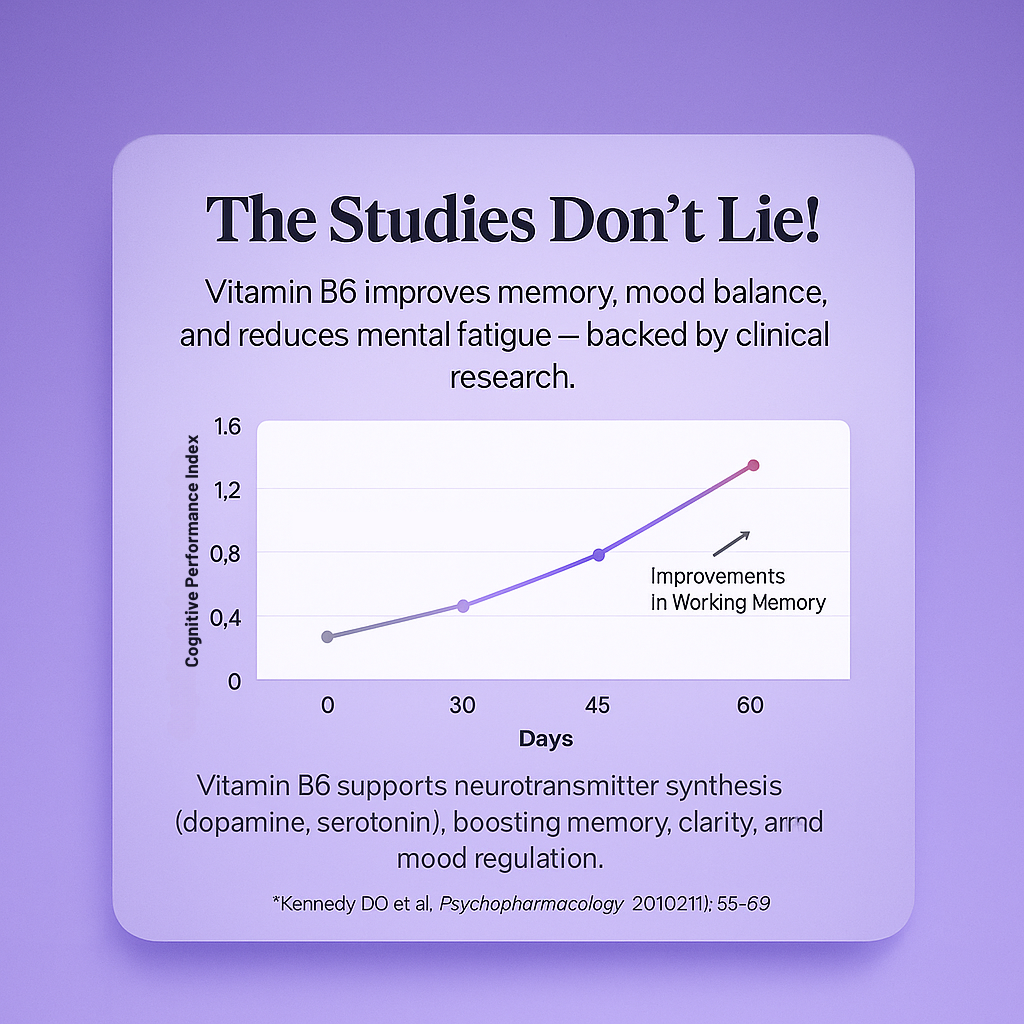 Vitamin B6 supports the production of dopamine, serotonin, and GABA - three chemicals that directly affect focus, mood, and mental clarity. With enough B6, your brain processes information faster, stays balanced under stress, and avoids mental fatigue during long periods of concentration.