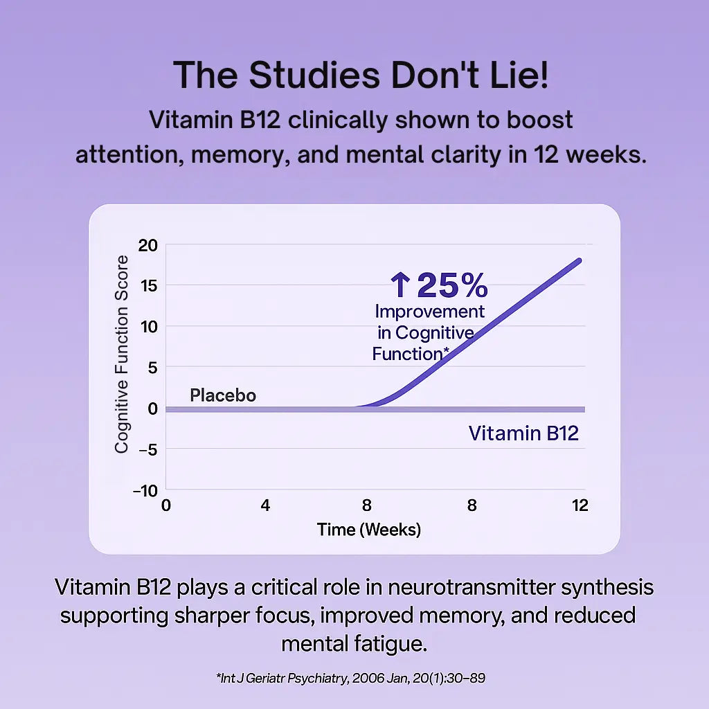 A 2021 randomized, double-blind, placebo-controlled study published in Nutrients found that daily supplementation with methylcobalamin significantly improved cognitive performance — including working memory, attention, and mental processing speed — in adults with low-normal B12 levels. The researchers concluded that “methylcobalamin may enhance cognitive functioning even in individuals without clinical deficiency.”